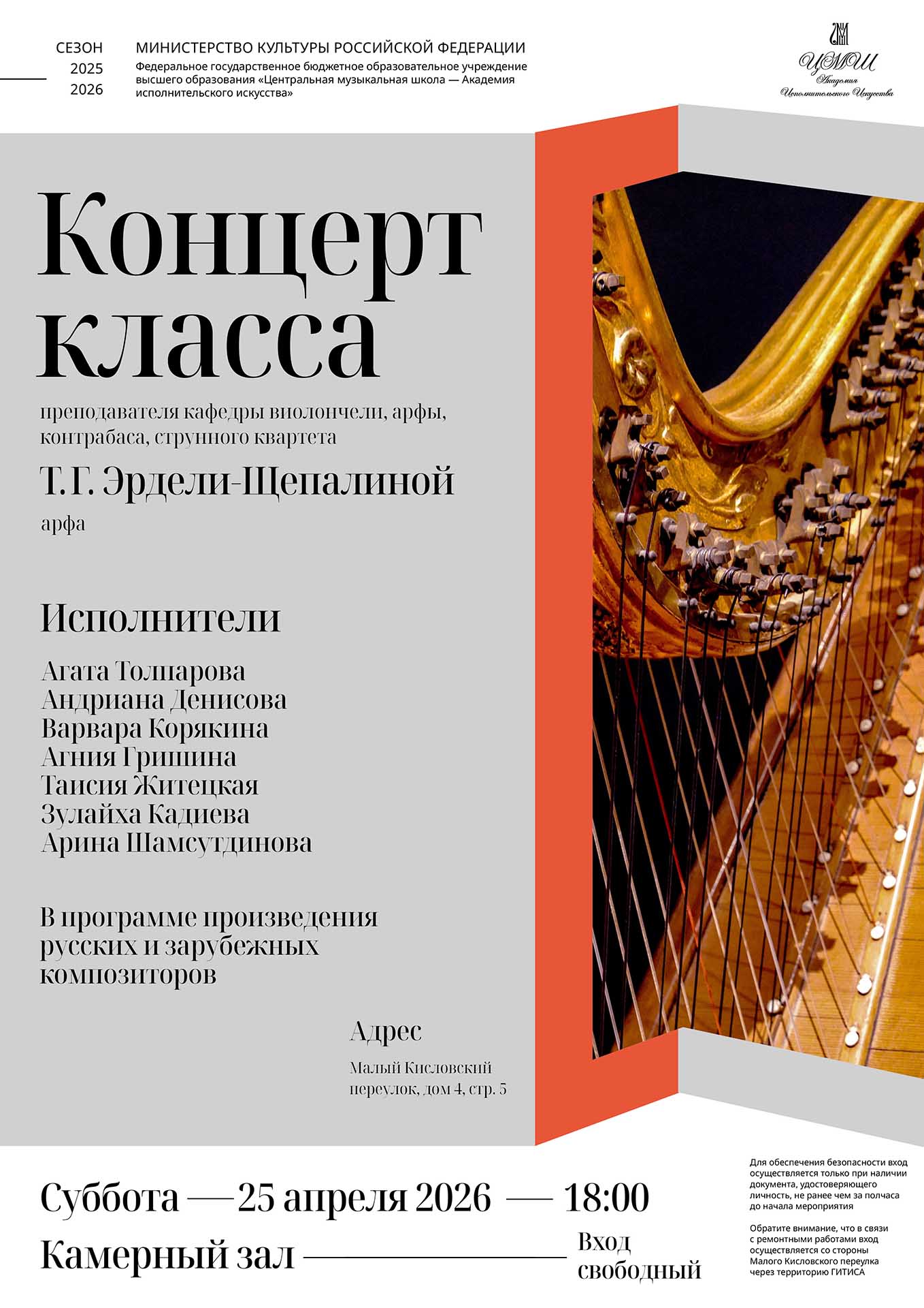 Концерт класса преподавателя кафедры виолончели, арфы, контрабаса, струнного квартета Т.Г. Эрдели-Щепалиной (арфа)